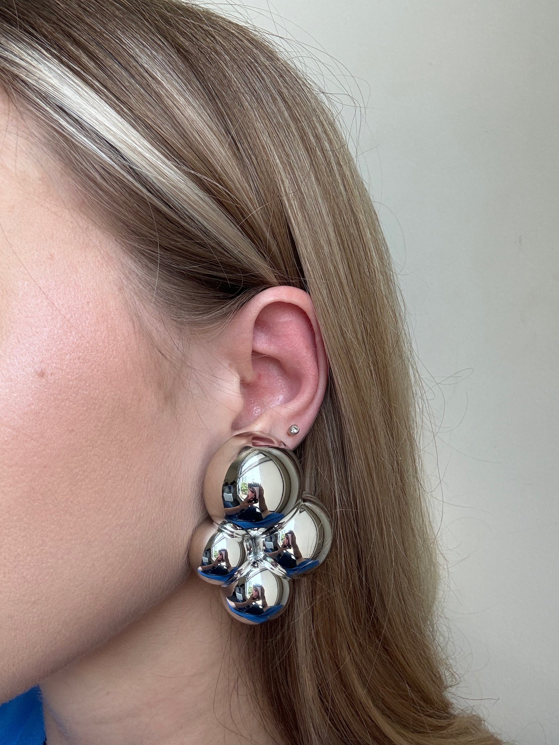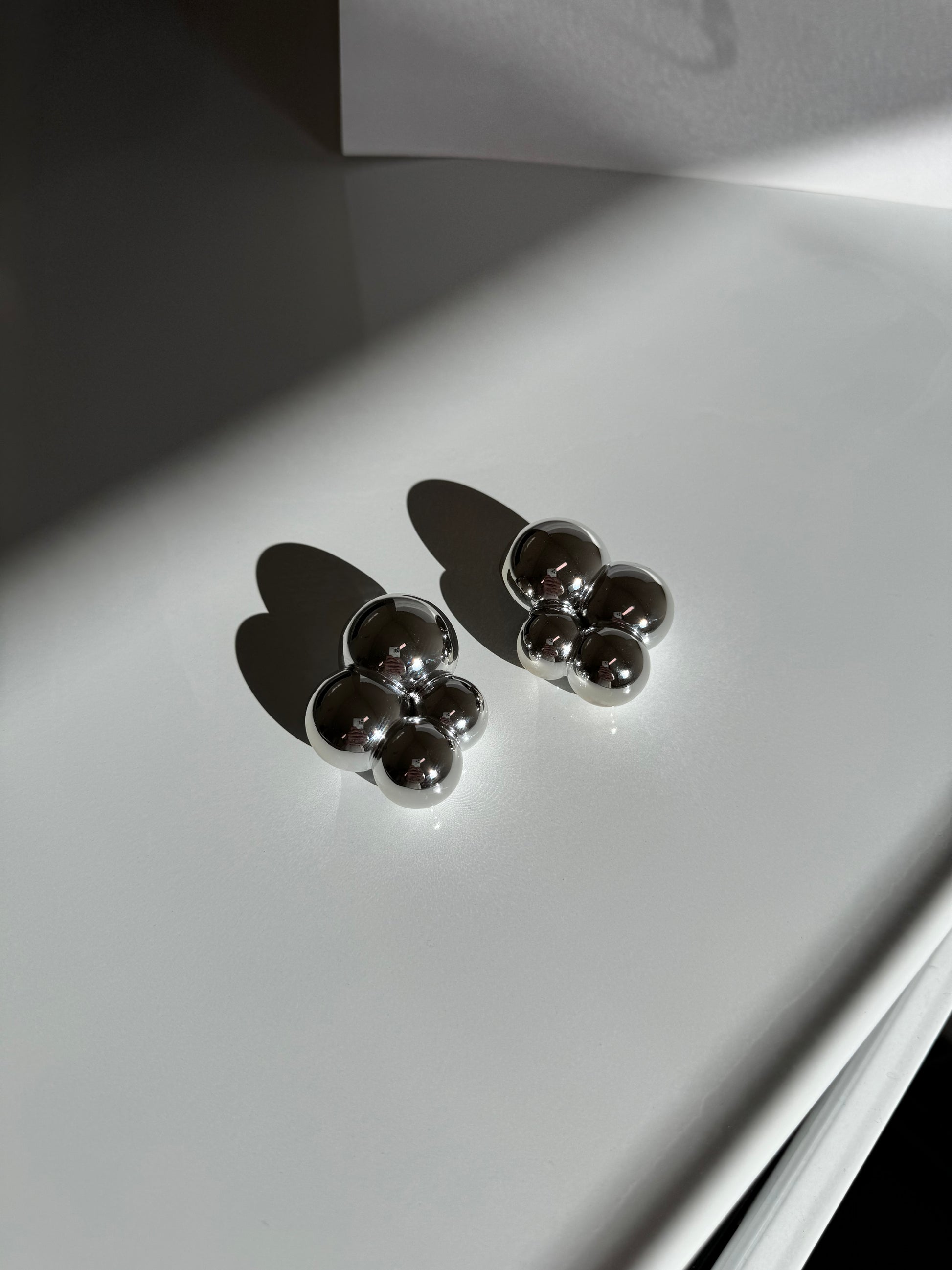 These earrings feature a cluster of mirrored spheres expertly crafted using 3D printing technology, with a Silver plated finish.