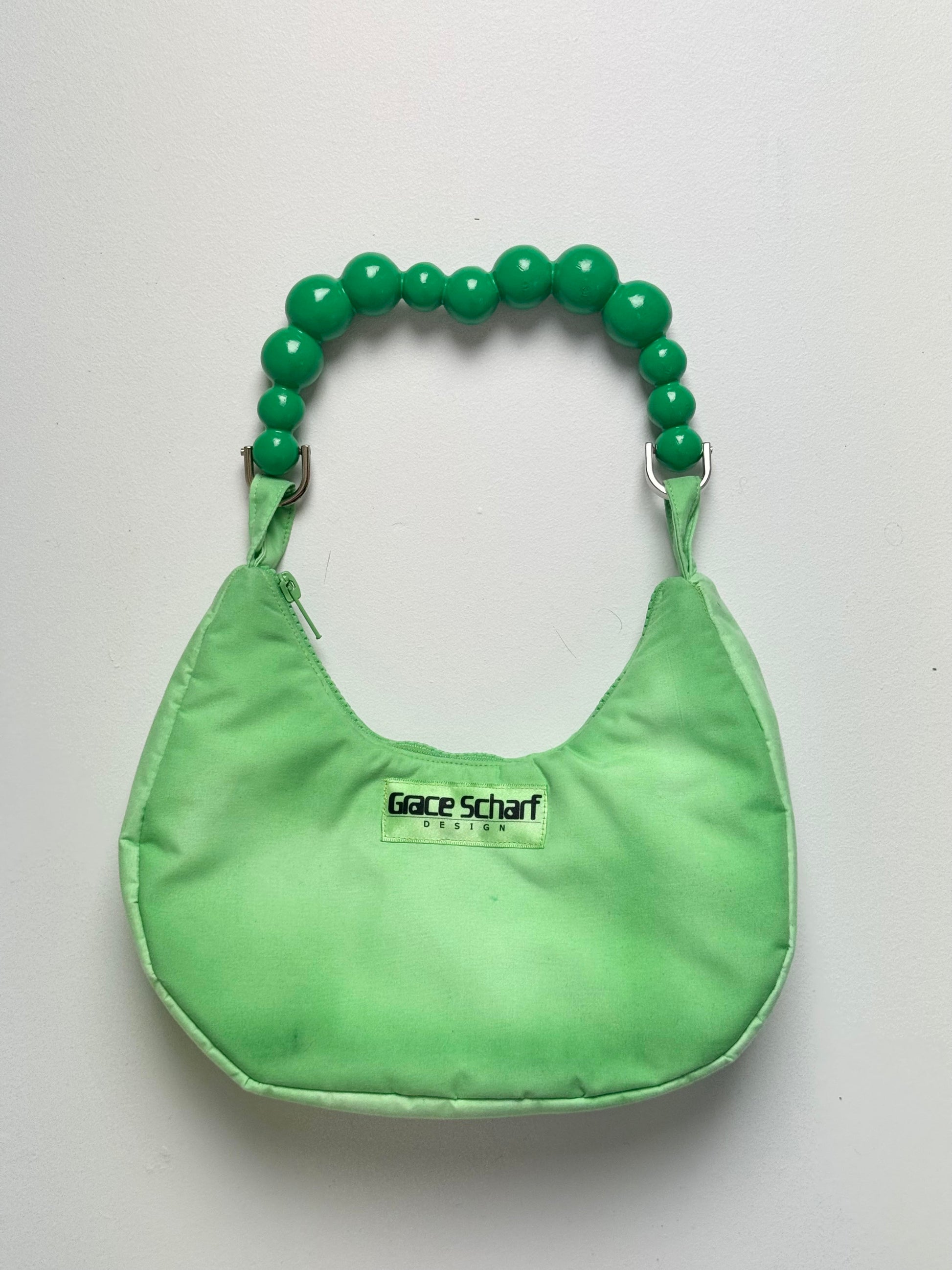 The Slice Bag in Green is a one-of-a-kind, hand-painted bag featuring a contemporary 3D-printed handle.